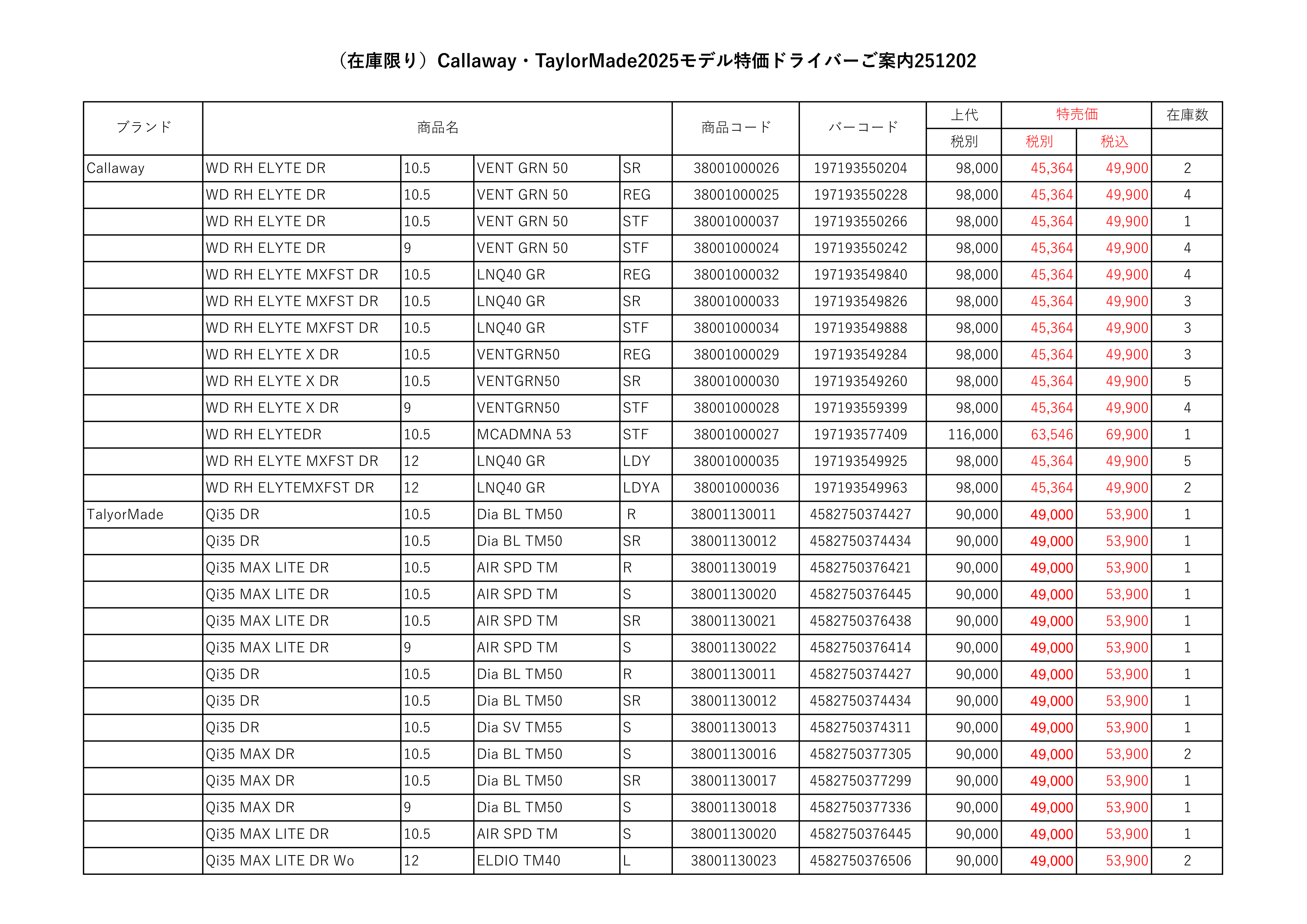 (在庫限り)Callaway・TaylorMade025モデル特価ドライバーご案内2512