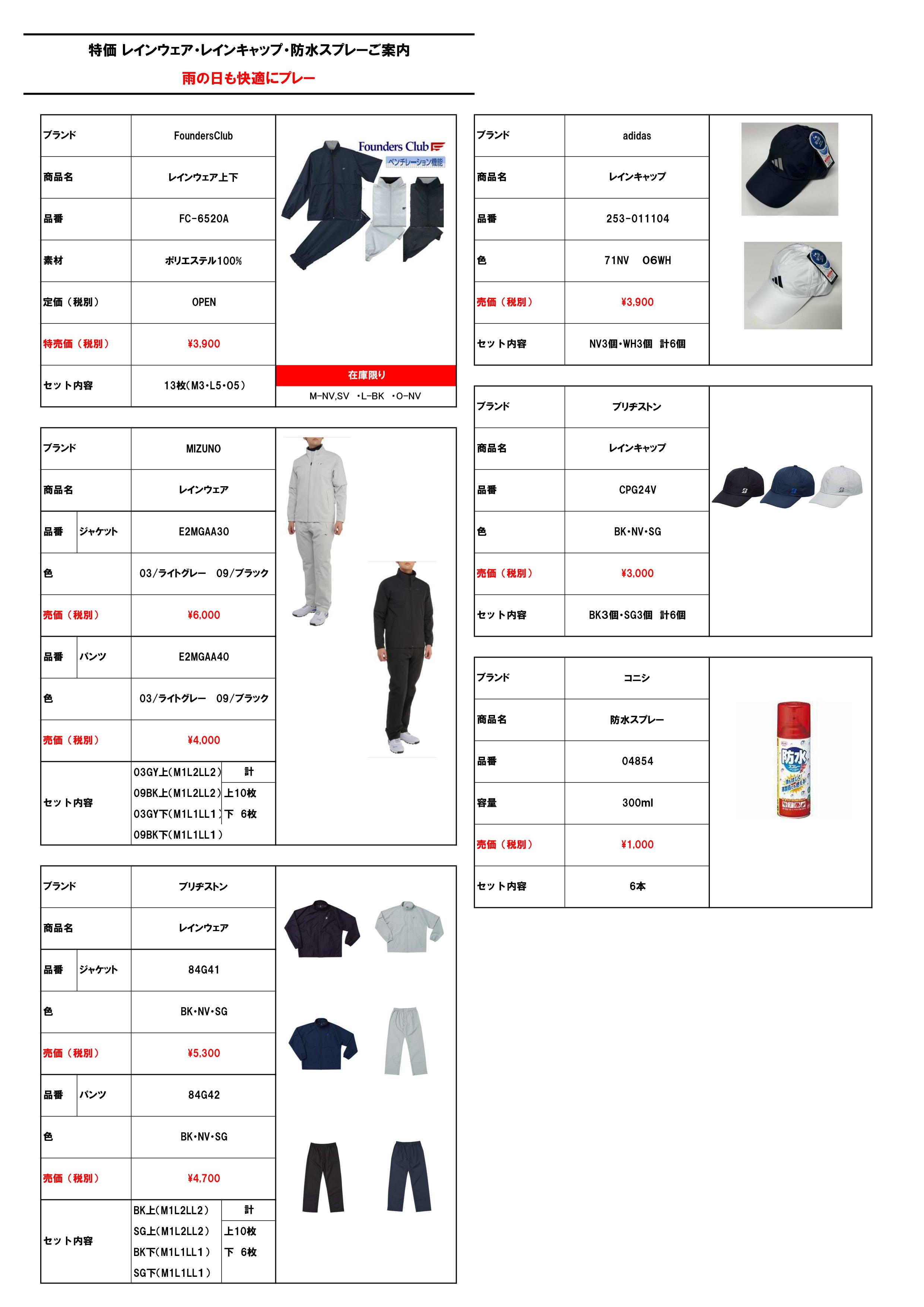 特価レインウェア・レインキャップ・防水スプレーご案内